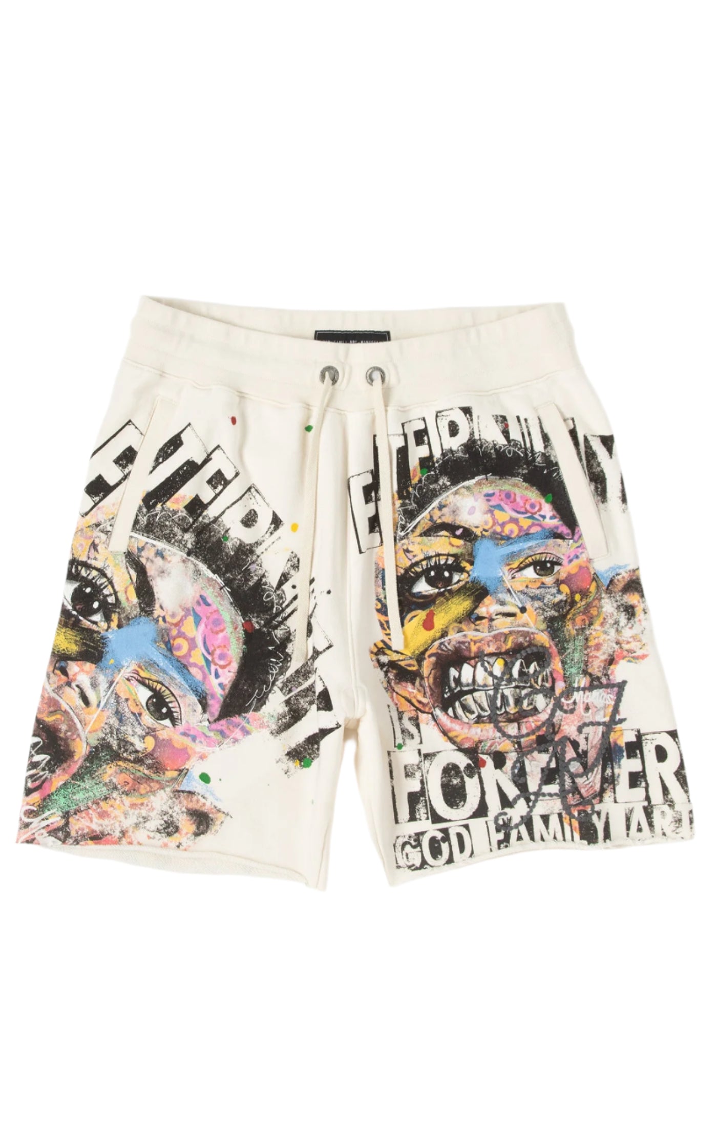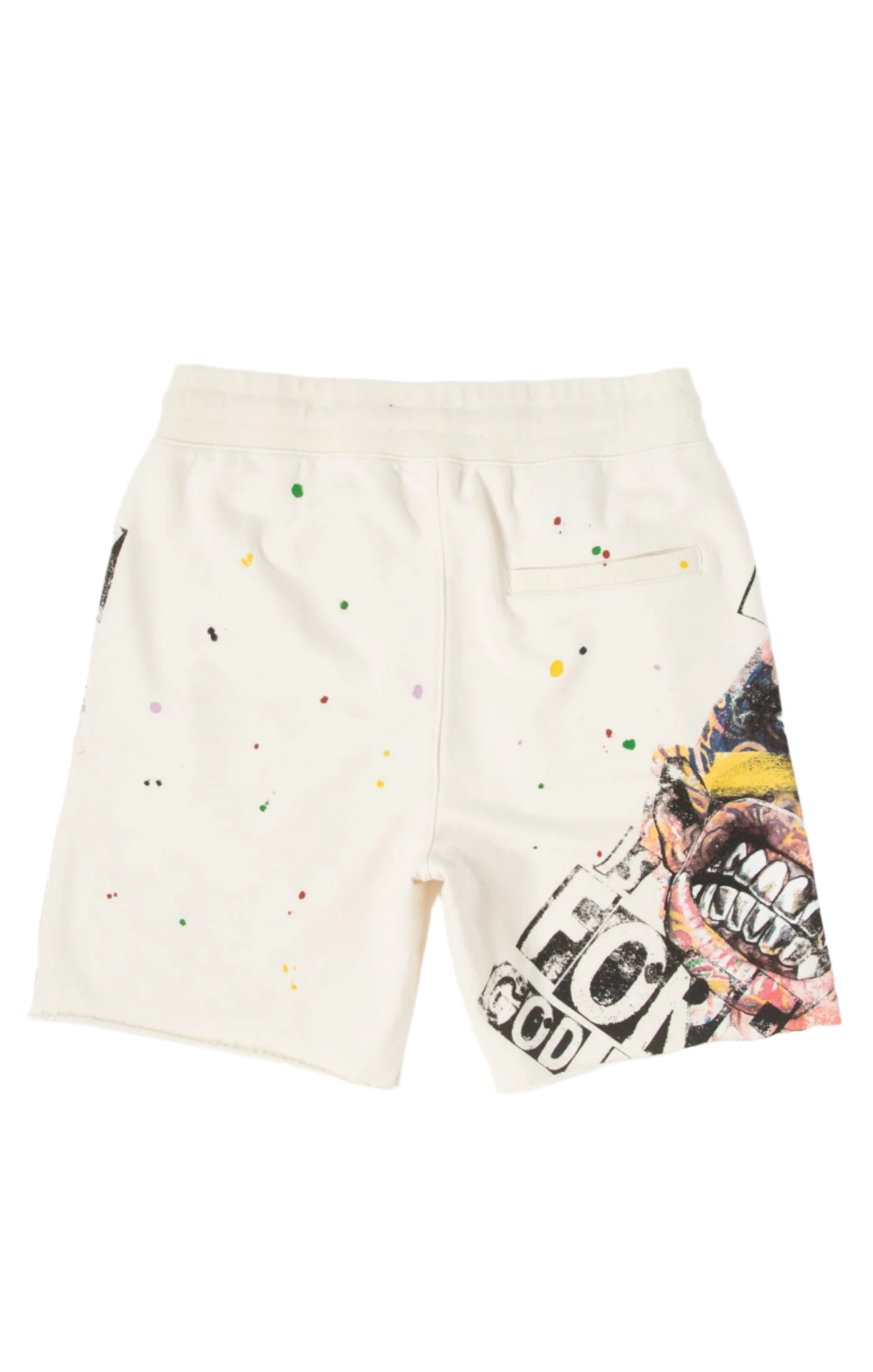 Sweatshort with adjustable waist, print, embroidery, and paint splatter.