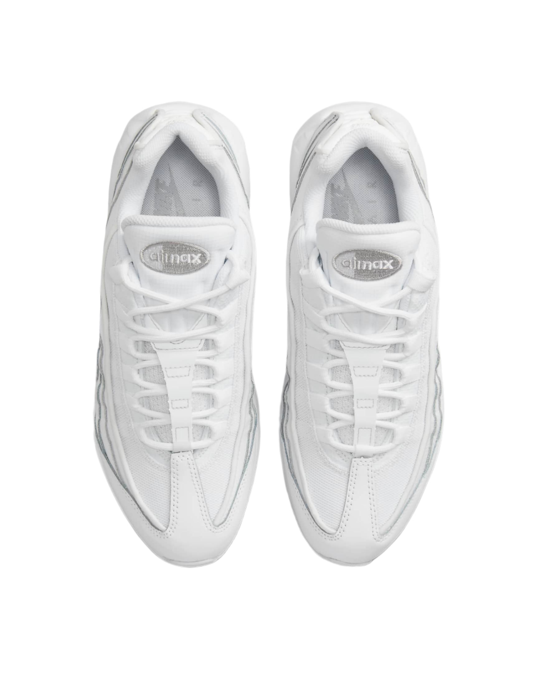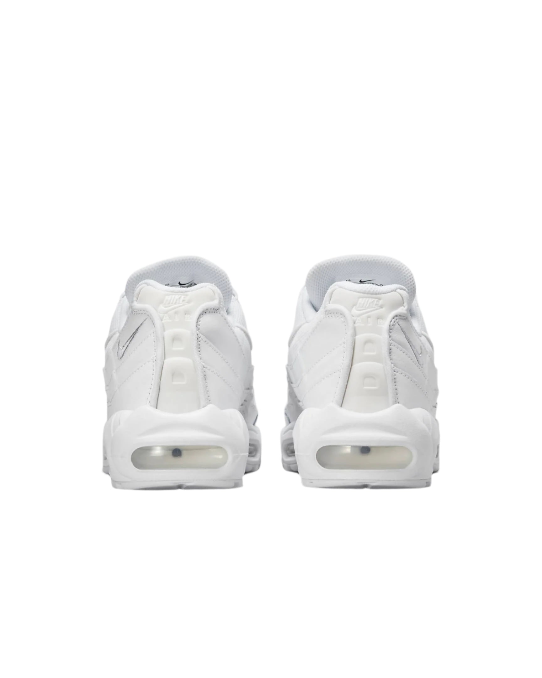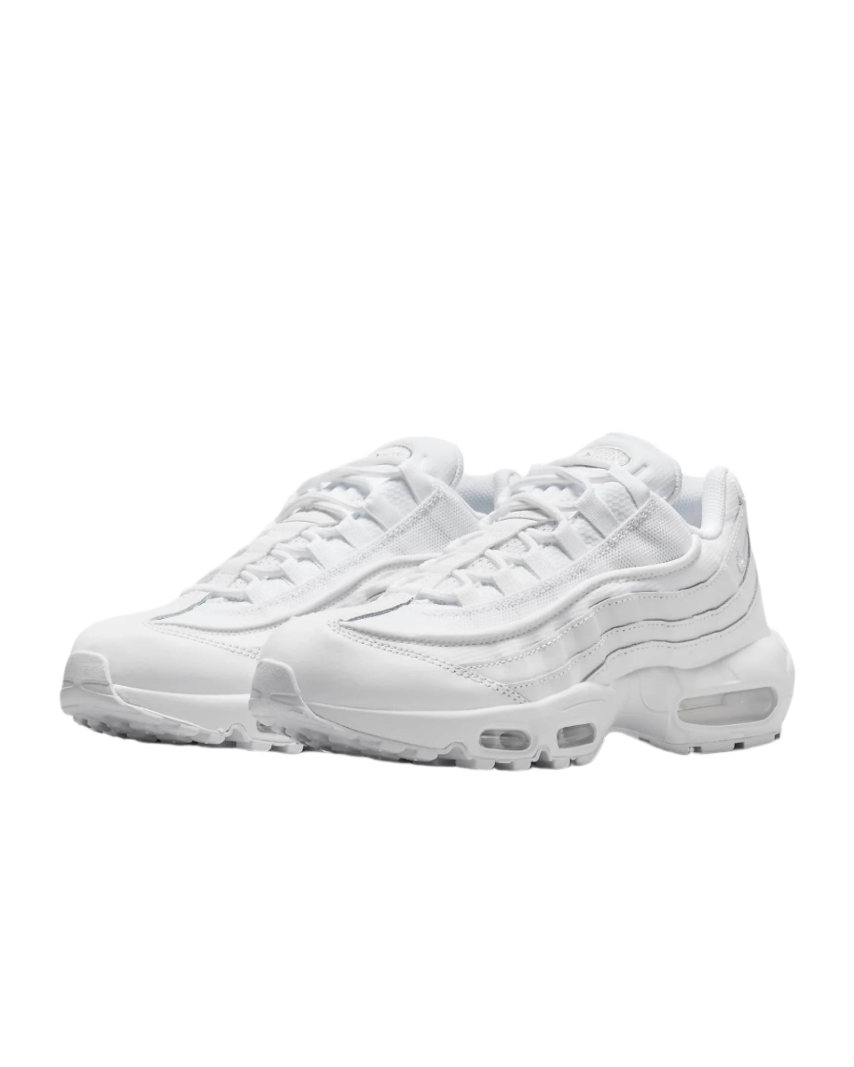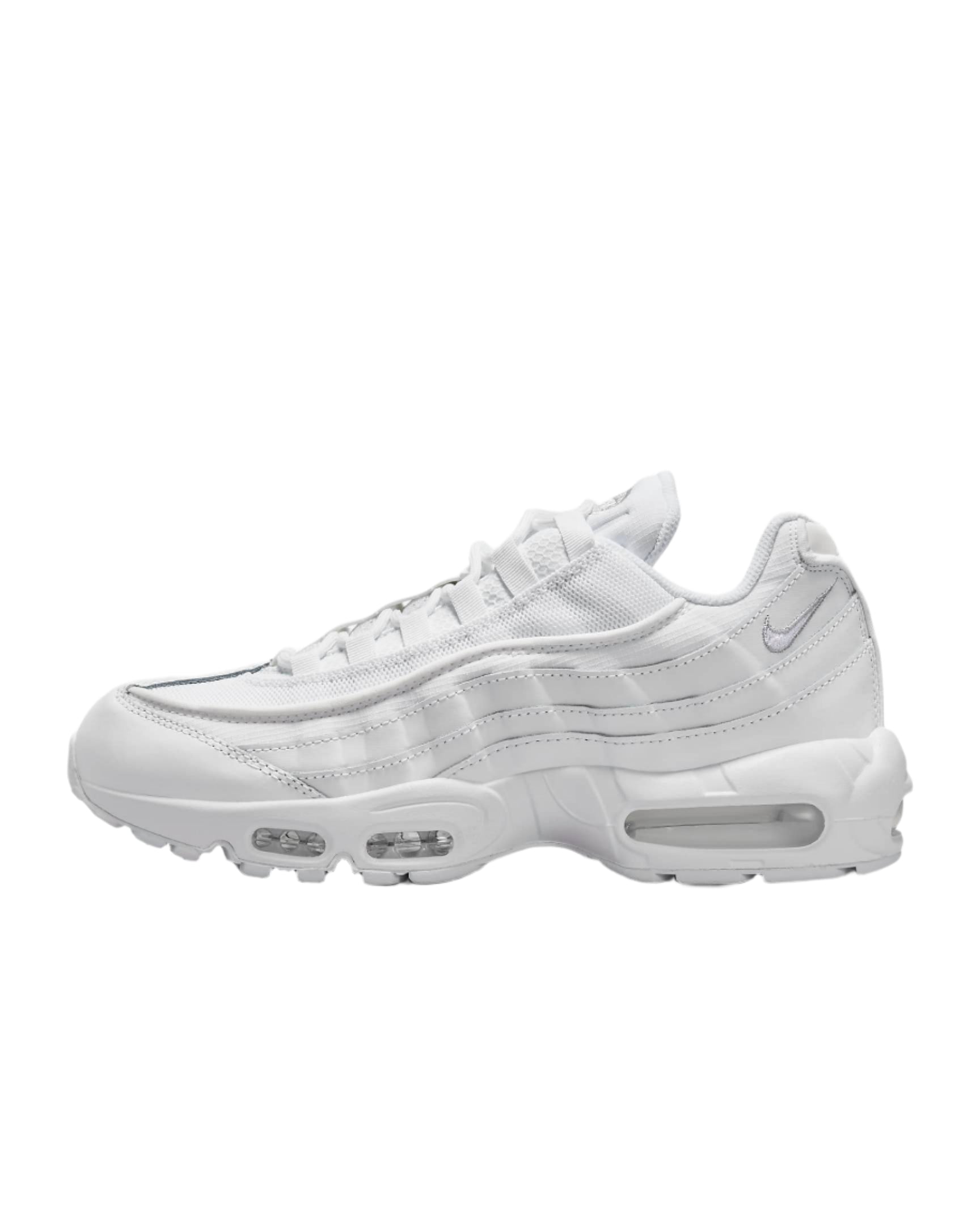 The Nike Air Max 95 Essential White Grey Fog is white with grey fog accents. The footwear is designed with a mesh upper, reinforced with full-grain leather overlays. It has white, fast-lace laces and can be slipped on. Its sole is flat with a thickness of 4cm. The footwear insoles are non-removable with a textile lining. The midsole is made of foam. The footwear further has visible Nike Air cushioning. A small Nike Swoosh is on one side of the heel.