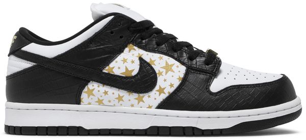 The Supreme x Nike Dunk Low OG SB QS ‘Black’ represents an homage to the partner brands’ Dunk High release from 2003. The low-top brings back virtually every key feature of the older shoe, including a white leather base, printed gold stars and contrast-colored overlays in croc-embossed leather. Gold Nike hits at the heel tab and woven tongue tag are matched by a gilded Supreme lace jewel. Inside the shoe, Supreme and Nike SB branding decorates the custom sock liner, finished in a bold red hue and fitted with a Zoom Air unit for lightweight cushioning.